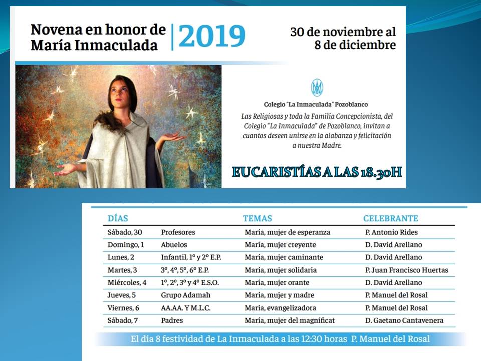 Nuestro colegio se prepara para vivir intensamente la novena en honor a nuestra titular, que comenzará el día 30 de noviembre hasta el día de su festividad, el 8 de diciembre, día de la "Inmaculada Concepción". Durante todos estos días, la eucaristía la amenizará un grupo de nuestra gran familia Concepcionista (alumnos, profesores, AAAA, abuelos, etc.). Estáte muy atento y vive con nosotros la novena UNIDOS A MARÍA INMACULADA.