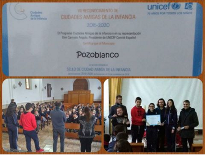 El día 21 de diciembre nuestro alcalde, D. Emiliano Pozuelo, el concejal de Servicios Sociales, D. Modesto Sánchez, y la trabajadora social, Dª Amadori Llamas, han visitado nuestro colegio para hacernos entrega del Sello Ciudad Amiga de la Infancia que le ha sido concedido a nuestra localidad.